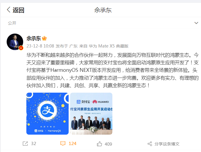 12月8日,华为常务董事、终端BG CEO、智能汽车解决方案BU董事长余承东在微博发文表示:华为不断和越来越多的合作伙伴一起努力,发展面向万物互联时代的鸿蒙生态。