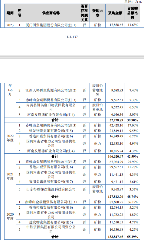 深究招股书可以发现,2020年-2022年,岷山环能的第一大供应商均为山金瑞鹏,采购额分别为8.76亿元、6.8亿元、4.24亿元,占比分别为36.19%、25.92%、17%。