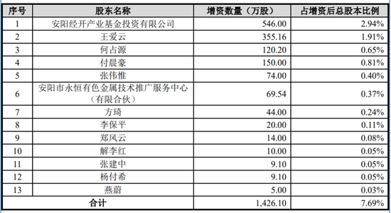 与安阳经开产投同时参与增资的,还有9位新增自然人股东付晨豪、张伟惟、方琦、李保平、郑风云、解李红、张建中、杨付希、燕蔚,以及岷山环能的持股平台安阳市永恒有色金属技术推广服务中心(有限合伙)(以下称“永恒合伙”)。此外,王爱云、何占源母子此次也参与了增资。