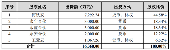 其中,何秋安的女婿付晨豪持有永宁合伙80.67%的份额,何秋安的儿媳方琦持有永宁合伙3.33%的份额,何秋安兄弟的配偶马冬玲持有永宁合伙1%的份额,王爱云的兄弟王双喜持有永宁合伙0.33%的份额,何秋安的外甥女陈嫣伟持有永宁合伙1.67%的份额、持有永恒合伙28.76%的份额,陈嫣伟父亲陈天保持有永宁合伙0.67%的份额、持有永恒合伙28.76%的份额,陈嫣伟的兄弟陈川持有永宁合伙0.67%的份额,何秋安的兄弟何福亮持有永安合伙1.81%的份额、持有永恒合伙0.83%的份额,何秋安的姐姐何秀芹持有永安合伙1.99%的份额,何秋安的兄弟何四军持有永安合伙0.72%的份额、持有永恒合伙0.83%的份额。