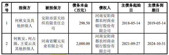 其中,岷山环能对安阳市雷天纺织有限责任公司(以下称“雷天纺织”)提供的担保事宜,主债务已经逾期。目前,雷天纺织正在陆续偿还本金及利息,而岷山环能的实控人何秋安未来可能承担还本付息的担保责任。