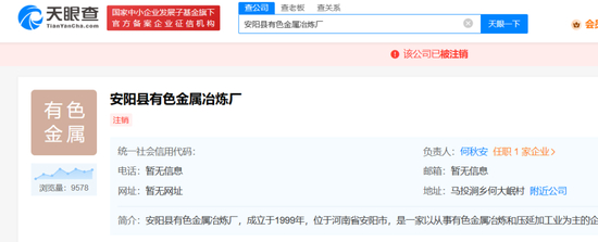 根据天眼查的信息显示,安阳县有色金属冶炼厂、目前已处于注销状态。但安阳县马投涧肉鸡分割厂的相关工商信息,并未查询到。