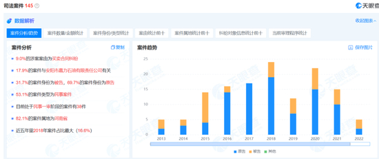 天眼查显示,岷山环能涉及的司法案件达145起,其中69.7%的案件身份为原告,31.7%的案件身份为被告,目前处于民事一审阶段的案件有38起,9%的涉案案由为买卖合同纠纷。