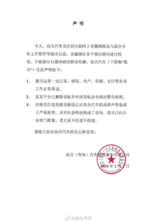 对此,《每日经济新闻》记者向高合汽车方面进行求证,但截至发稿未获回应。不过,记者留意到,高合汽车通过社交平台发布声明称,公司运营一切正常,研发、生产、营销、交付等各项工作正常推进。“原发平台已删除该帖并对该发帖会员做出警告处理。对相关信息的错误解读已对高合汽车的品牌声誉造成了严重损害,并对社会與论构成了误导,我司已向公安部门报案。请大家不信谣不传谣。”高合汽车在声明中称。