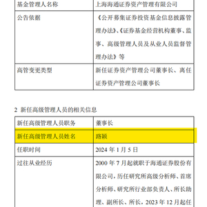 1月8日,海通资管发布的基金行业高级管理人员变更公告显示,路颖新任证券资产管理公司董事长,任职时间是2024年1月5日。同时公告,裴长江因工作安排,离任证券资产管理公司董事长。