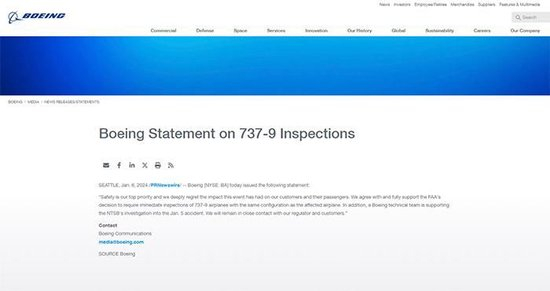 事故发生后,多家航空公司对涉事型号飞机采取停飞措施。波音公司也发表声明称,“安全是我们的首要任务,我们对此次事件给我们的客户及其乘客造成的影响深表遗憾。我们同意并全力支持美国联邦航空管理局的决定,要求立即检查同型号客机。”
