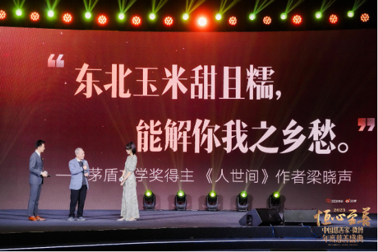 该奖项的颁奖嘉宾是茅盾文学奖得主、著名作家梁晓声先生。在去年的农民丰收节,梁晓声为农特产购物节做了一次代言,代言了家乡东北的玉米,并写下《人间玉米》一文。梁晓声现场分享了自己的对公益慈善的理解,展现出想要助力家乡发展的拳拳之心,也体现出他的公益情怀。