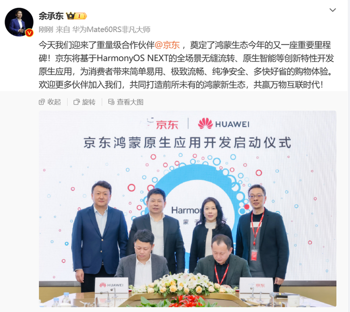 余承东发布微博称,今天我们迎来了重量级合作伙伴@京东,奠定了鸿蒙生态今年的又一座重要里程碑!