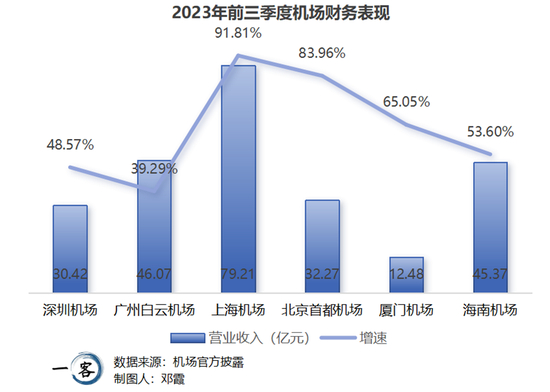 而说最赚钱,手握浦东机场和虹桥机场的上海机场,毫无悬念地拔得头筹,凭借前三季度79.21亿元的营业收入,91.81%的同比增速遥遥领先。