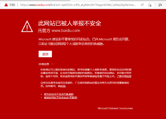 新浪科技讯 1月29日下午消息,今日,#百度 Edge#话题登上微博热搜,据多位网友反馈,微软浏览器提示百度搜索结果不安全,Microsoft Edge 浏览器将百度的搜索结果显示为“此网站已被人举报不安全”的警告语,需要展开详细,然后选择“继续访问此不安全站点(不推荐)”才能访问相关页面。