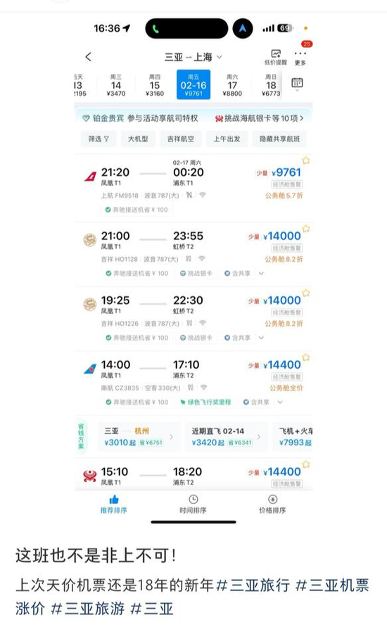 2月13日上午,记者在携程旅行搜索注意到,目前三亚回程机票价格确实在暴涨。以三亚飞上海为例,2月14日-15日,只剩少量的全价经济舱机票,价格在3500元左右。公务舱的价格从8000元至17000元不等。2月16日-17日,经济舱的机票几乎全部售罄,公务舱的价格均在14000元以上。