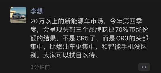 在 2023 四季报发布之后,李想向投资人强调,未来五年,理想不会做 20 万元以下的车型。