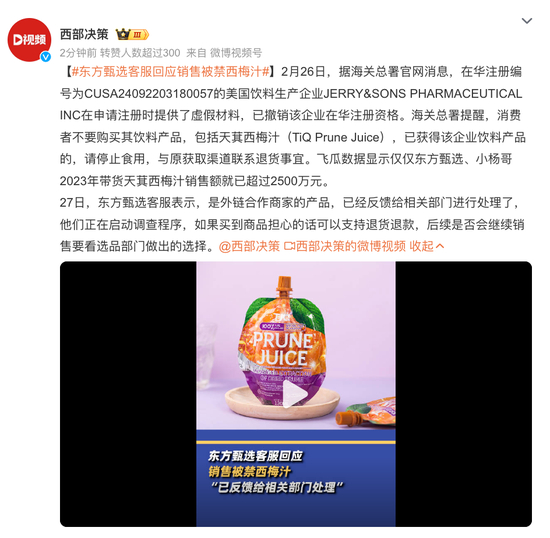 不要购买停止食用!东方甄选、小杨哥带货的西梅汁被点名,涉事美企已被撤销在华注册资格