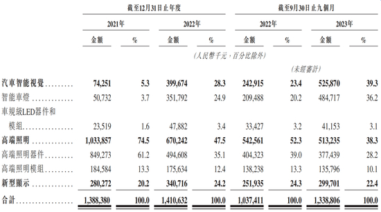 港交所招股书显示,晶科电子为融合LED+技术的智能视觉产品及系统解决方案提供商,收入主要来自汽车智能视觉、高端照明及新型显示三大产品板块,目前晶科电子已经成为国内产业链中率先实现垂直整合的汽车整灯供货商之一,实现了从车规级LED器件和模块到智能照明系统的全链条覆盖。