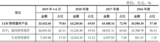 2016年-2018年,晶科电子营收分别为6.04亿元、9.03亿元、9.23亿元,对应净利润1340.40万元、5070.33万元、6727.45万元。LED照明器件产品分别贡献了57.48%、72.90%、69.05%的主营业务收入,是收入核心来源。