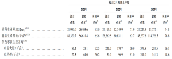 据相关数据,2023年,其晶科生产基地、联晶生产基地利用率为54.6%、78.8%;领为宁波生产基地的利用率车前大灯计为76.1%,车尾灯计为48.6%。