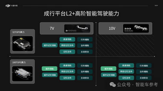 在此之前,大疆车载已量产了‘7V+32TOPS’的配置,可以实现‘城市记忆领航’(通勤模式)和高速NOA。