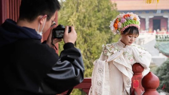 在许昌市曹魏古城景区,记者看到670米长的复古街人流如织,街上分布着20多家汉服店,还有专门提供跟拍服务的摄影师,不时有头戴簪花的游客往来穿梭,其中不少是冲着胖东来而来。