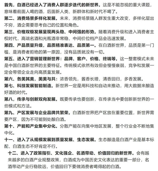 他还提出了一个概念——“白酒新世界”,并总结了白酒新世界的12个特证。