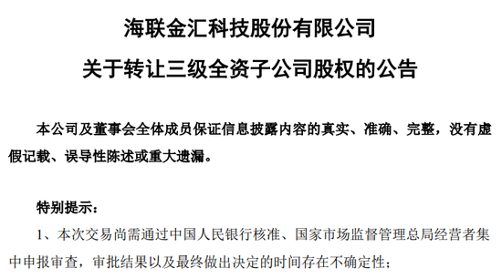据公告,海联金汇拟将全资三级子公司联动商务100%股权转让给天津同融,交易价格为基准转让对价7.5亿元+交割日净资产,测算总对价或超13亿元。