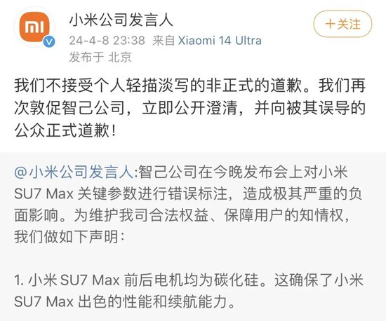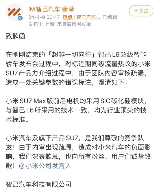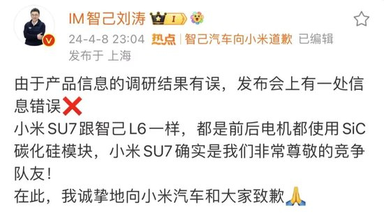 面对小米的控诉,刘涛于发布会当晚23时便在个人微博进行回复:“由于产品信息的调研结果有误,发布会上有一处信息错误。小米 SU7跟智己L6一样,都是前后电机都使用 SIC碳化硅模块,小米SU7确实是我们非常尊敬的竞争队友!在此,我诚挚地向小米汽车和大家致歉。”