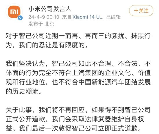 随后,小米连续发文称,“不接受个人轻描淡写的非正式的道歉。我们再次敦促智己公司,立即公开澄清,并向被其误导的公众正式道歉”,并表示“如果得不到智己公司正式公开道歉,我们会采取法律武器维护自身权益。我们最后一次敦促智己公司立即正式道歉”。
