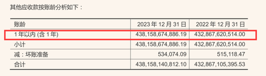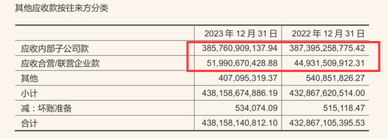 仔细分析母公司财报,发生其账上堆积着巨额其他应收款,2022年末为4300亿,2023年末为4400亿,分别占到了总资产的79%和83%。这些全是总部借给子公司和合联营公司的资金,看下图: