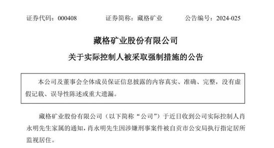 4月15日晚间,藏格矿业公告,公司于近日收到公司实际控制人肖永明家属的通知,肖永明因涉嫌刑事案件被自贡市公安局执行指定居所监视居住。