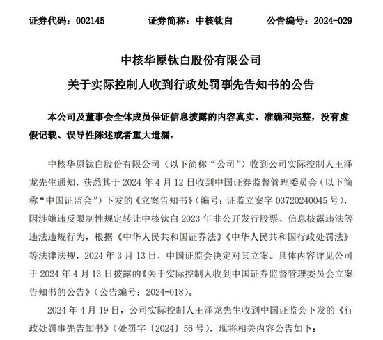 财联社4月19日讯(记者 高艳云)从公告被立案到收到处罚事先告知书,惊动市场的中核钛白实控人违规减持定增股票事件,仅过一周时间,就迎来了“严监严管”的处罚举措。中核钛白实控人、海通证券、中信证券各接到《行政处罚事先告知书》。就在一周前,上述主体同时接到证监会立案告知书。