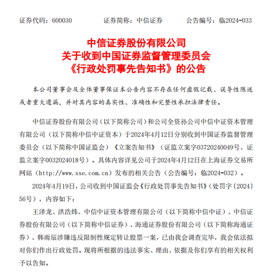 据了解,中信证券在收到告知书后立即召开党委会,通报相关情况,进行深刻反思,研究部署整改措施。中信证券表示,公司及中信中证资本将认真学习并积极贯彻资本市场新“国九条”,坚守主责主业,回归业务本源,充分发挥自身功能,切实保护投资者合法权益,更好服务资本市场高质量发展。