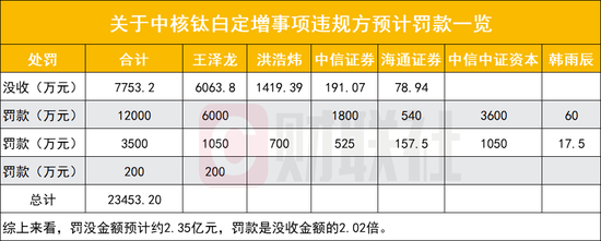 经计算,中核钛白实控人王泽龙、洪浩炜(王泽龙朋友)、中信中证资本、中信证券、海通证券、韩雨辰预计罚没合计2.35亿元,其中预计罚款金额合计1.57亿元,没收预计金额合计7753.2万元,预计罚款金额是没收金额的2.02倍,与“没一罚二”相当。