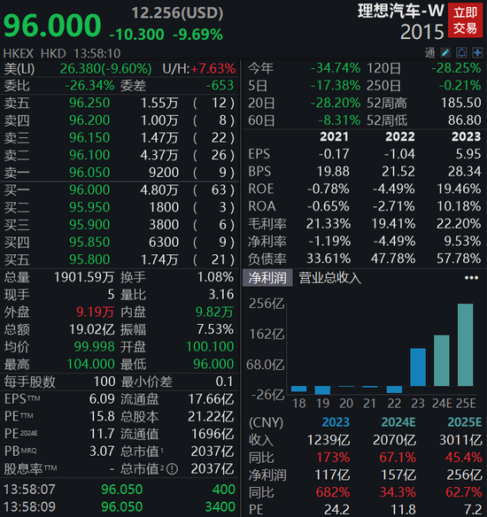 4月22日,理想汽车(02015.HK)开盘跌5.93%,截至下午发稿报96港元/股,总市值2037亿港元。