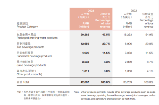 近日,农夫山泉(09633)披露的2023财报显示,去年公司426.67亿元总营收,包装饮用水产品为202.62亿元,增速为10.9%,占总收入的比例为47.5%;饮料产品占总营收比例为51.7%。这也意味着公司饮料产品的收入反超饮用水。
