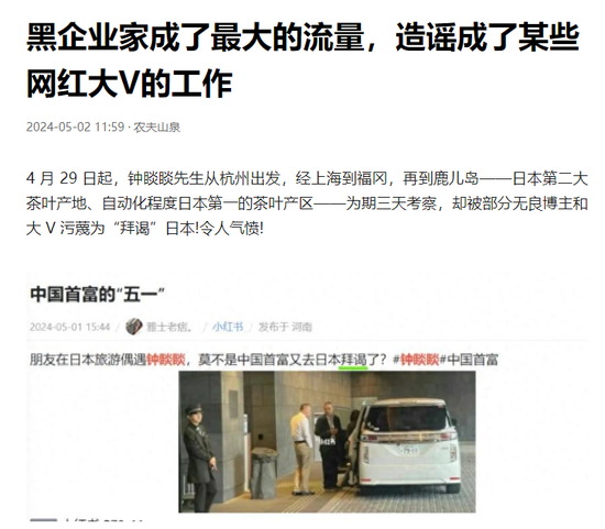 据农夫山泉头条号,4月29日起,钟睒睒先生从杭州出发,经上海到福冈,再到鹿儿岛——日本第二大茶叶产地、自动化程度日本第一的茶叶产区——为期三天考察。不过,钟睒睒的此行,被部分无良博主和大V污蔑为“拜谒”日本。