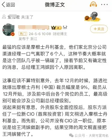 5月6日,有财经博主爆料称: 摩根士丹利基金北京分公司渠道经理一口气离职了6个人 。博主猜测:这种节奏大概率就是这个团队几乎被一锅端了。