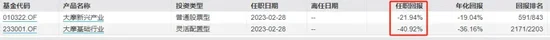 以陈修竹管理的大摩新兴产业和大摩基础行业为例,自2023年2月28日担任基金经理以来, 任职回报分别为-21.94%和-40.92%,排名几近垫底。