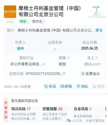 摩根士丹利基金官网显示,其在北京和上海均设有分公司。天眼查显示,北京分公司成立于2005年,2022年员工20人,今年2月8日法人由李锦变更为徐许。