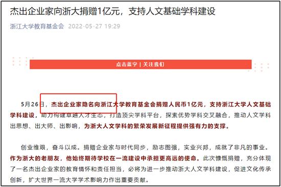 你敢相信吗?2022年5月26日向浙江大学教育基金会捐赠1亿元的匿名杰出企业家即为钟睒睒。与钟睒睒交往多年的浙江财经大学副校长魏江在给《涌金楼》的文章《宗老与老钟》中提及,“我可以告诉大家一个真实的事,老钟(钟睒睒)曾一次性给某大学捐赠1个亿(元),不报道、不搞仪式、不留名,而且这样的事情不少。”