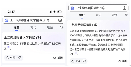 拿“给日本捐款5000万、给哈佛大学捐款1亿”来说,其实网上找不到任何权威媒体的报道,农夫山泉自己的官方账号,也从未发布过相关内容。搞笑的是,在某搜索引擎问人工智能“王二狗给哈佛大学捐了多少钱?”,人工智能回答道:“王二狗在2014年确实给哈佛大学捐助了3.5亿美元。”很多网友发布的所谓“钟睒睒对日、对美捐款”信息可能就是来自这类人工智能的答复。