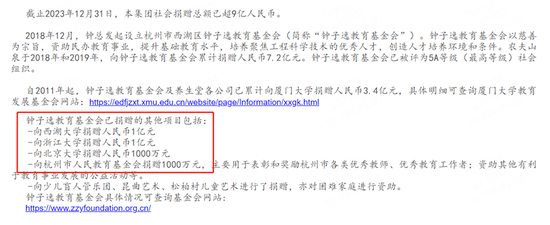 农夫山泉在公布的捐赠明细中也提到一系列针对大学的捐赠: