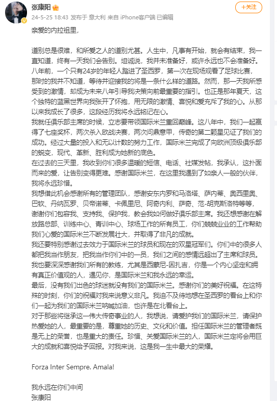 在担任国米主席后,张康阳大手笔花钱,引入大牌教练和球员。在8年时间里为国际米兰带来了2个意甲冠军,2个意大利杯冠军以及3个意大利超级杯冠军,还在2023年杀入了欧冠决赛,最终惜败曼城。从竞技层面来看,这是张康阳为国米做出的最大贡献。