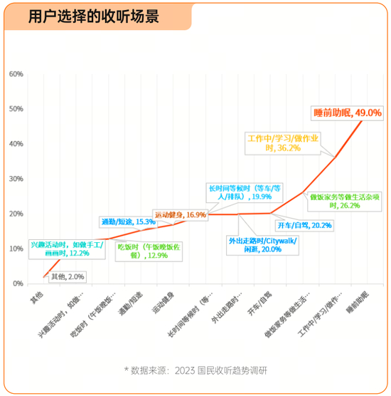 喜马拉雅发布的一份用户报告显示,开车自驾、通勤短途、外出走路、睡前等,都在成为用户收听音频的重要场景,“声音经济”也因此而崛起——艾媒咨询发布的数据显示,2023年中国“声音经济”产业规模超过5100亿元。