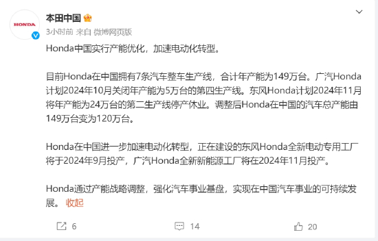 本田中国称,此举为实行产能优化,加速电动化转型。目前本田在中国拥有7条汽车整车生产线,合计年产能为149万台。广汽本田计划2024年10月关闭年产能为5万台的第四生产线。东风本田计划2024年11月将年产能为24万台的第二生产线停产休业。调整后本田在中国的汽车总产能由149万台变为120万台。