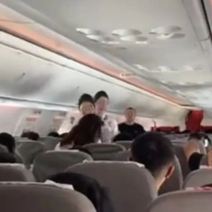 在视频中,乘客不停煽动着手中的纸板,乘务员端着水来回安抚乘客。