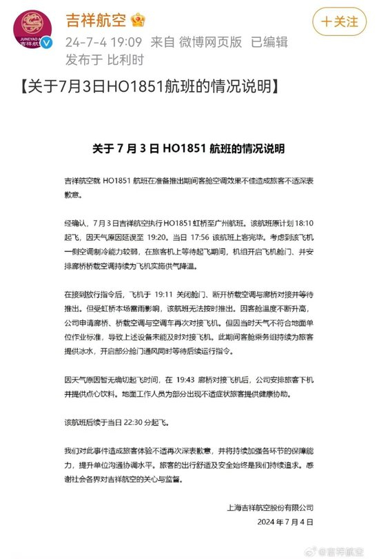 7月4日晚,吉祥航空在官方微博发布《关于7月3日HO1851航班的情况说明》,就有乘客中暑一事致歉。吉祥航空表示,经确认,7月3日吉祥航空执行HO1851虹桥至广州航班。受虹桥雷雨影响,该航班延误。考虑到该飞机一侧空调制冷能力较弱,在前期等待起飞期间,机组开启飞机舱门、并安排廊桥桥载空调持续为飞机实施供气降温。但后期因当时天气不符合地面单位作业标准,导致上述设备未能及时对接飞机。因天气原因暂无确切起飞时间,公司安排旅客下机并提供点心饮料。地面工作人员为部分出现不适症状旅客提供健康协助。该航班后续于当日22:30起飞。