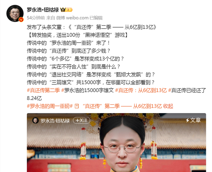 已还8.24亿,还欠5亿多!罗永浩发布“真还传”新进展,微博已改名,“杀”回社交媒体