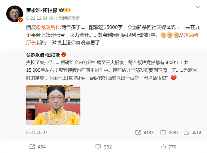 微博平台显示,此前因宣布退网后辟谣需要而注册的“罗永浩的辟谣号”已更名为“罗永浩·钮祜禄”,同时,该微博22日发布了一条内容,显示将在下周一(26日)发布一则15000字左右的重磅雄文,并配上了个人的“熹贵妃回宫照”。