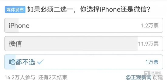 其中,一家媒体给出的投票结果显示,如果必须二选一,在14.2万人参与的投票中,有11.9万人选择了微信。“这不仅是两款产品之间的选择,更是中国品牌和美国品牌之间的比拼,更何况当下iPhone的可替代性很大,但微信就不一样了。”一名网友说道。