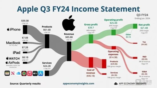 而此次事件的焦点“苹果税”,就是苹果的抽佣费用,近些年也是推动了苹果服务业务的高速增长。从苹果最新发布的财报可以看到,相比较压力较大的产品业务,服务业务的收入则是持续增长。卖硬件不如卖服务赚钱,也成为苹果公司这几个季度的写照。