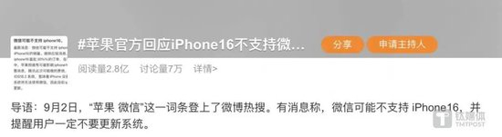 9月2日,有关“苹果 微信”这一词条登上了微博热搜。有消息称,微信可能不支持iPhone16,并提醒用户一定不要更新系统。对于多数人来说,这样的消息一看就是假的,但是在舆论场,则引起了广泛的讨论,并一度登上热搜榜的榜首位置。